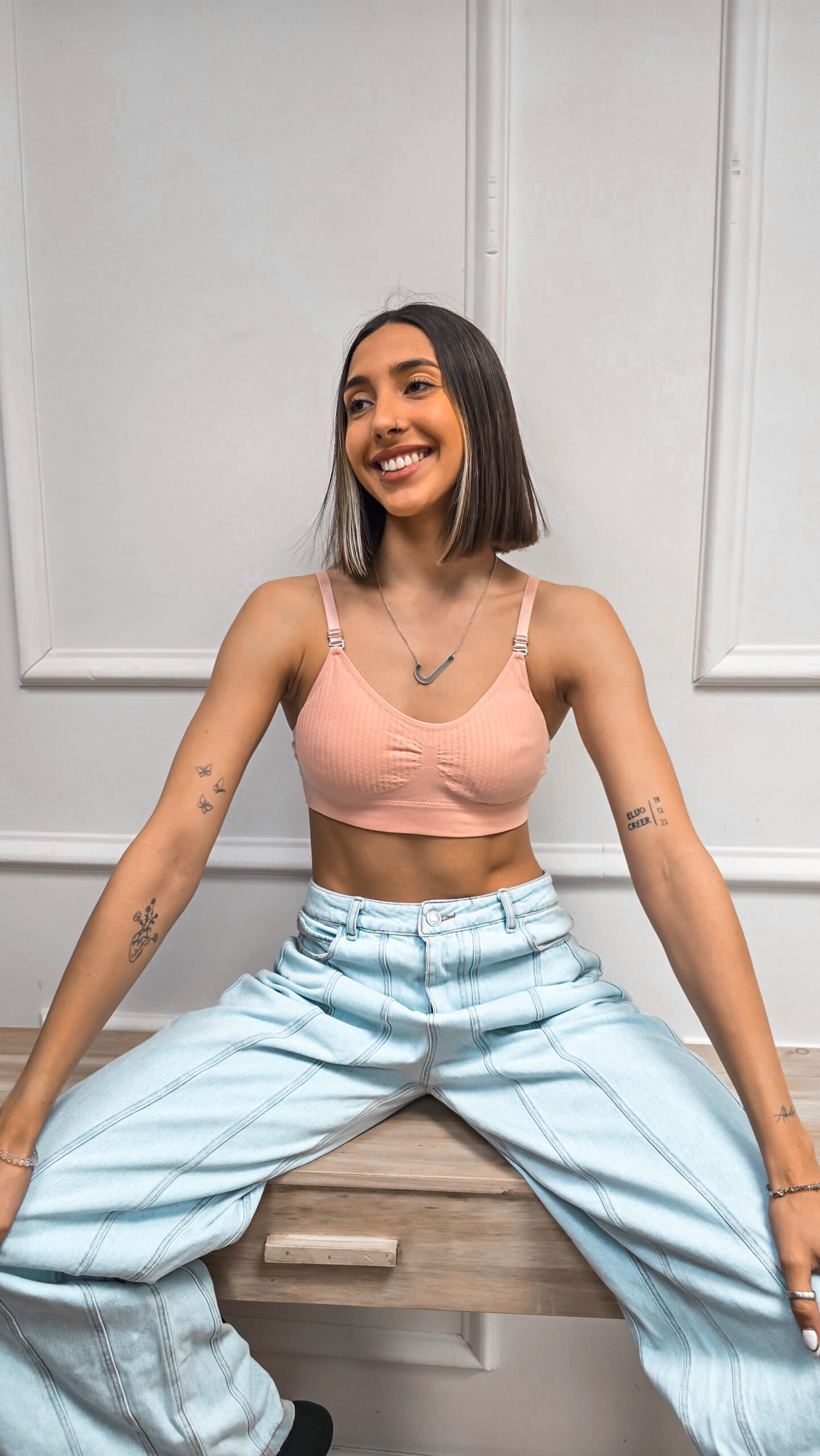 Corpiño de lycra de algodón texturado, con bajo busto, coleta ancha, prendidura trasera, tazas y breteles desmontables. SIN BOMBACHA.