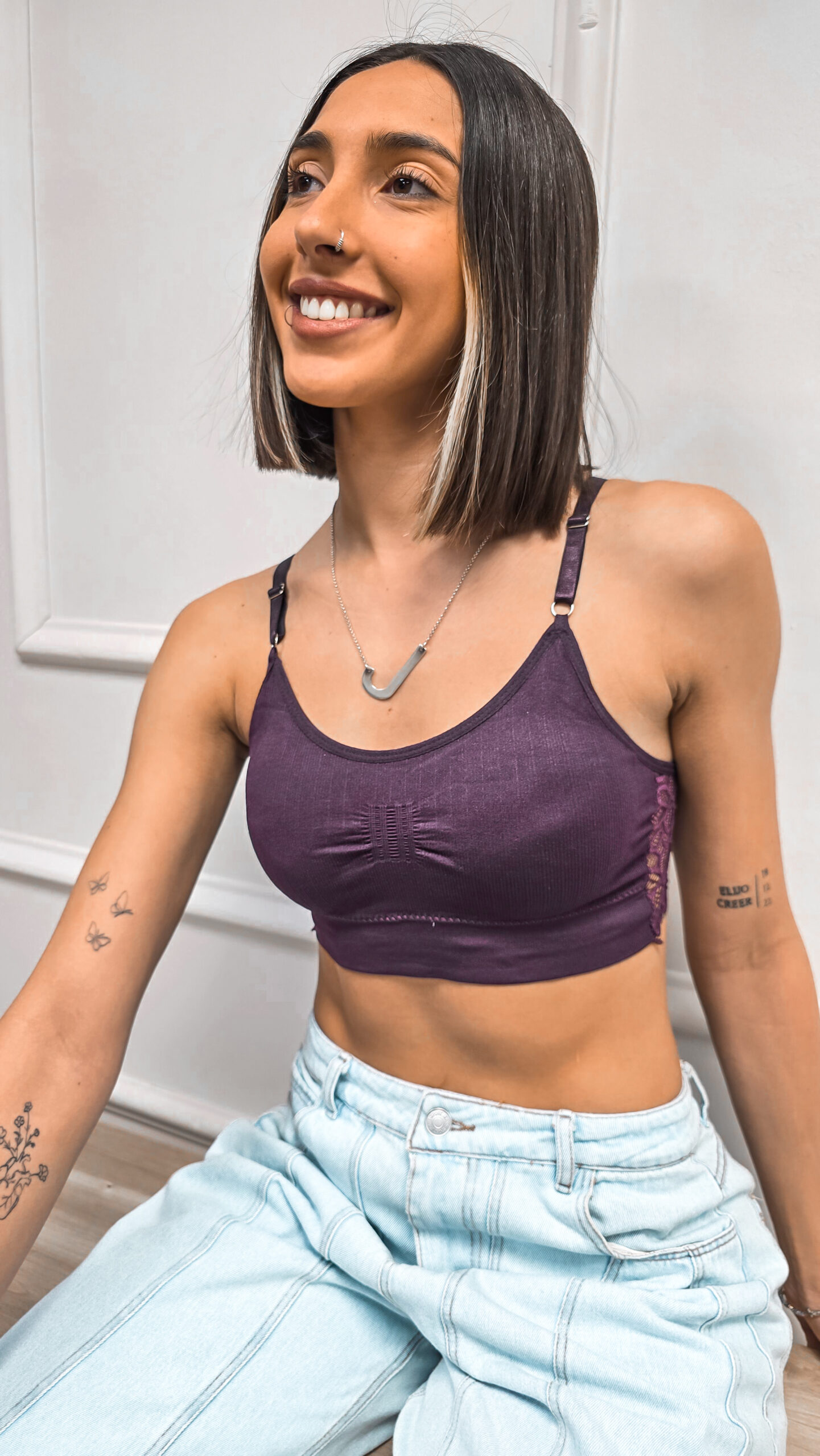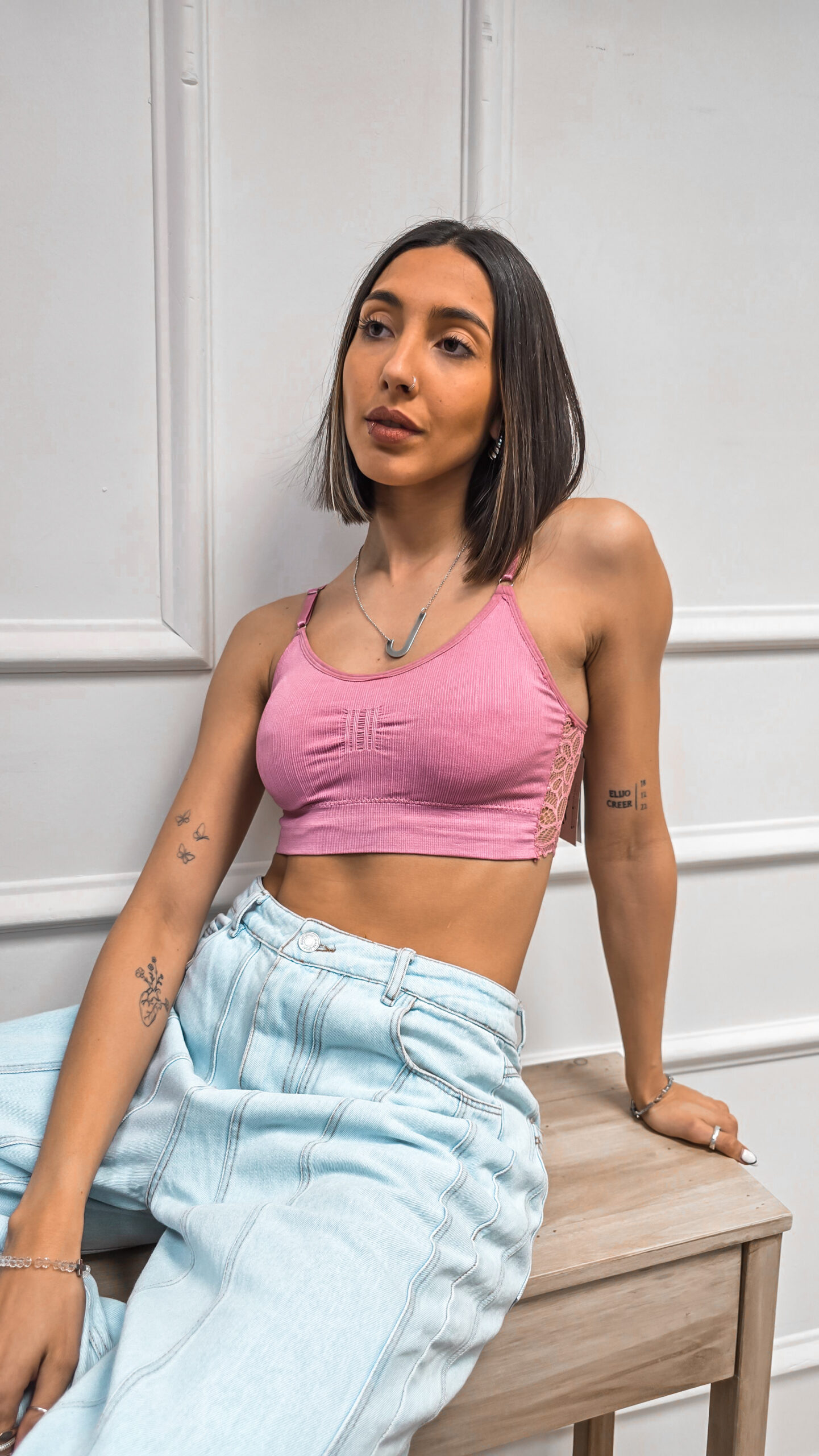 Corpiño de morley de algodón, bajo busto de elástico, coleta de encaje, prendidura trasera. Breteles regulables. SIN BOMBACHA.