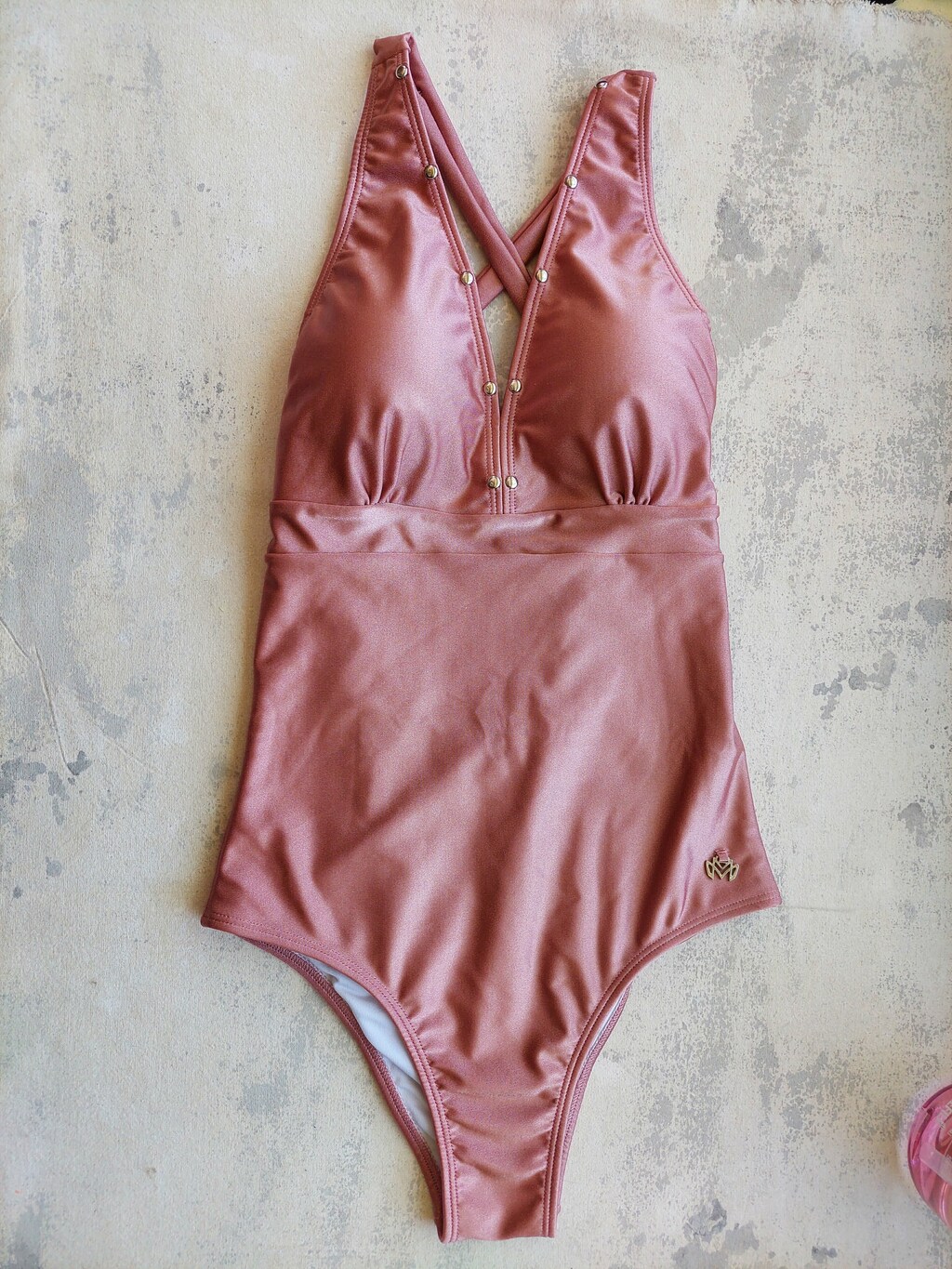 Enteriza forrada, escote en V, con detalle de tachas plateadas en el borde del escote. Bretel ancho tipo lazo ajustable en la espalda y se ata atrás. Espalda baja. Vedetina.