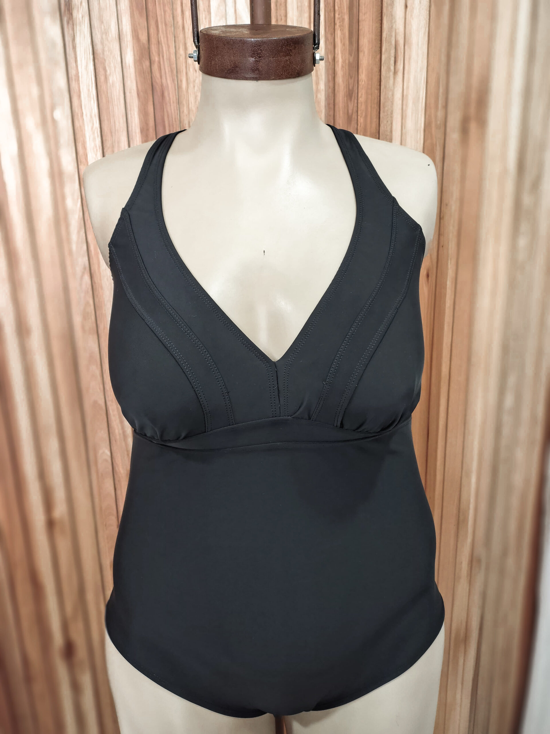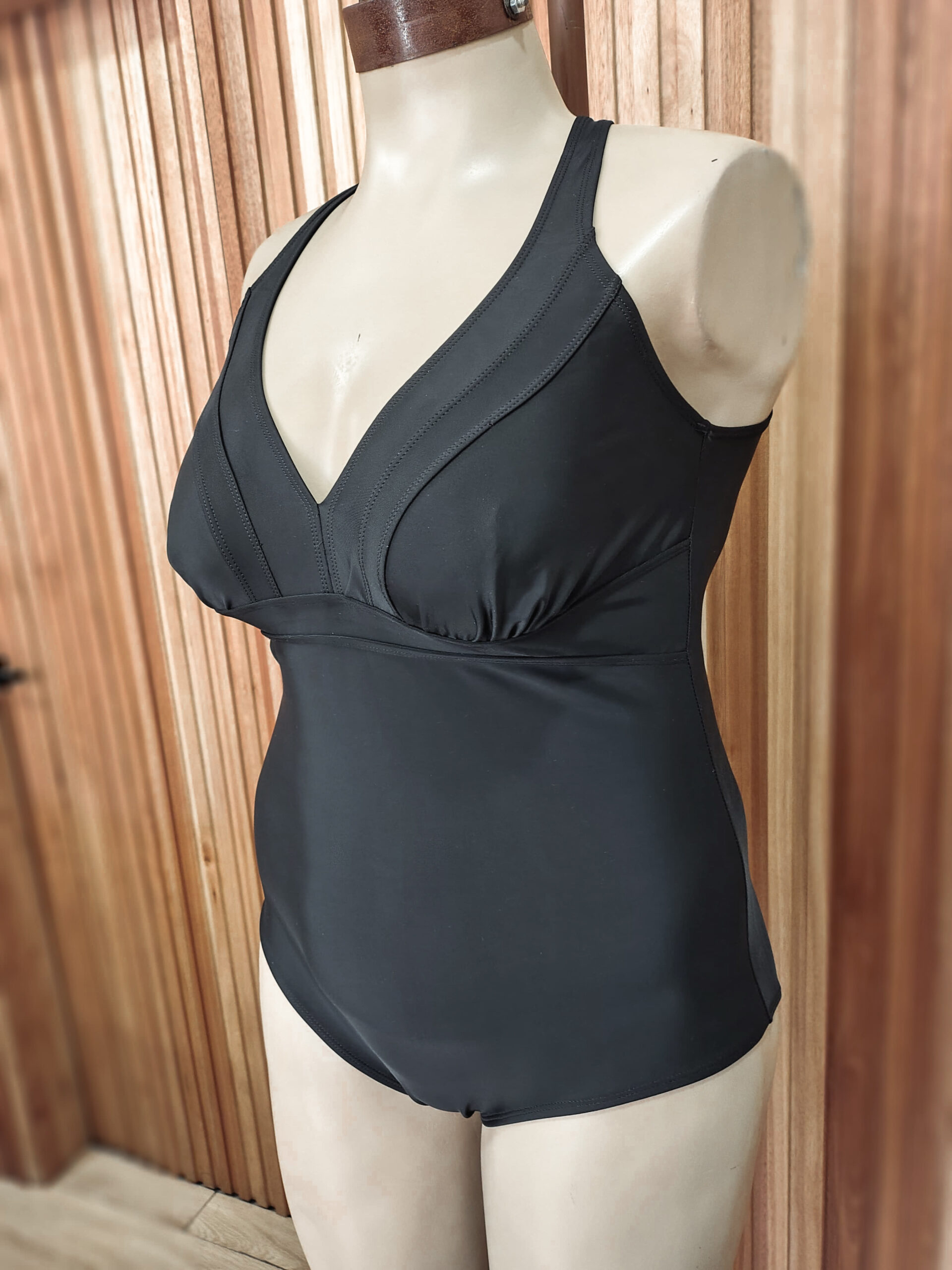 Enteriza básica de lycra, forrada. Con recortes en el bajo busto y en tazas. Bretel ancho, espalda media baja. Vedetina.