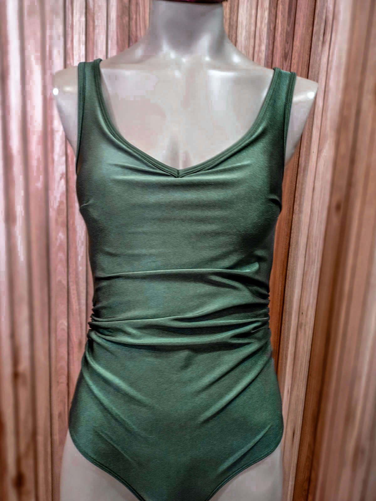 Enteriza de lycra forrada. Escote en V, breteles anchos. Espalda media baja. Vedetina. Delantera grapeada.