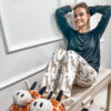 Pijama de algodón estampado. Remera mangas cortas, cuello redondo. Pantalón largo, con puños, lazo decorativo en la cintura.