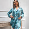 Pijama de seda estampado con corazones. Camisa mangas largas abotonada y pantalón largo con elástico en la cintura.